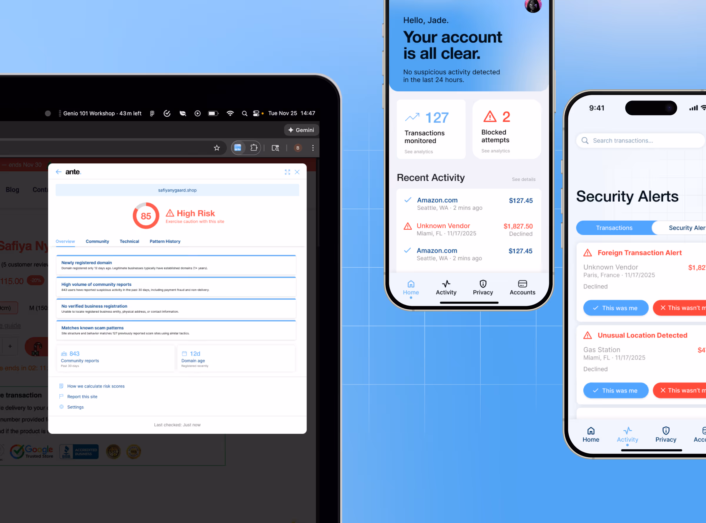 Flare is designed for different moments of risk, protecting users before and after transaction across two channels.